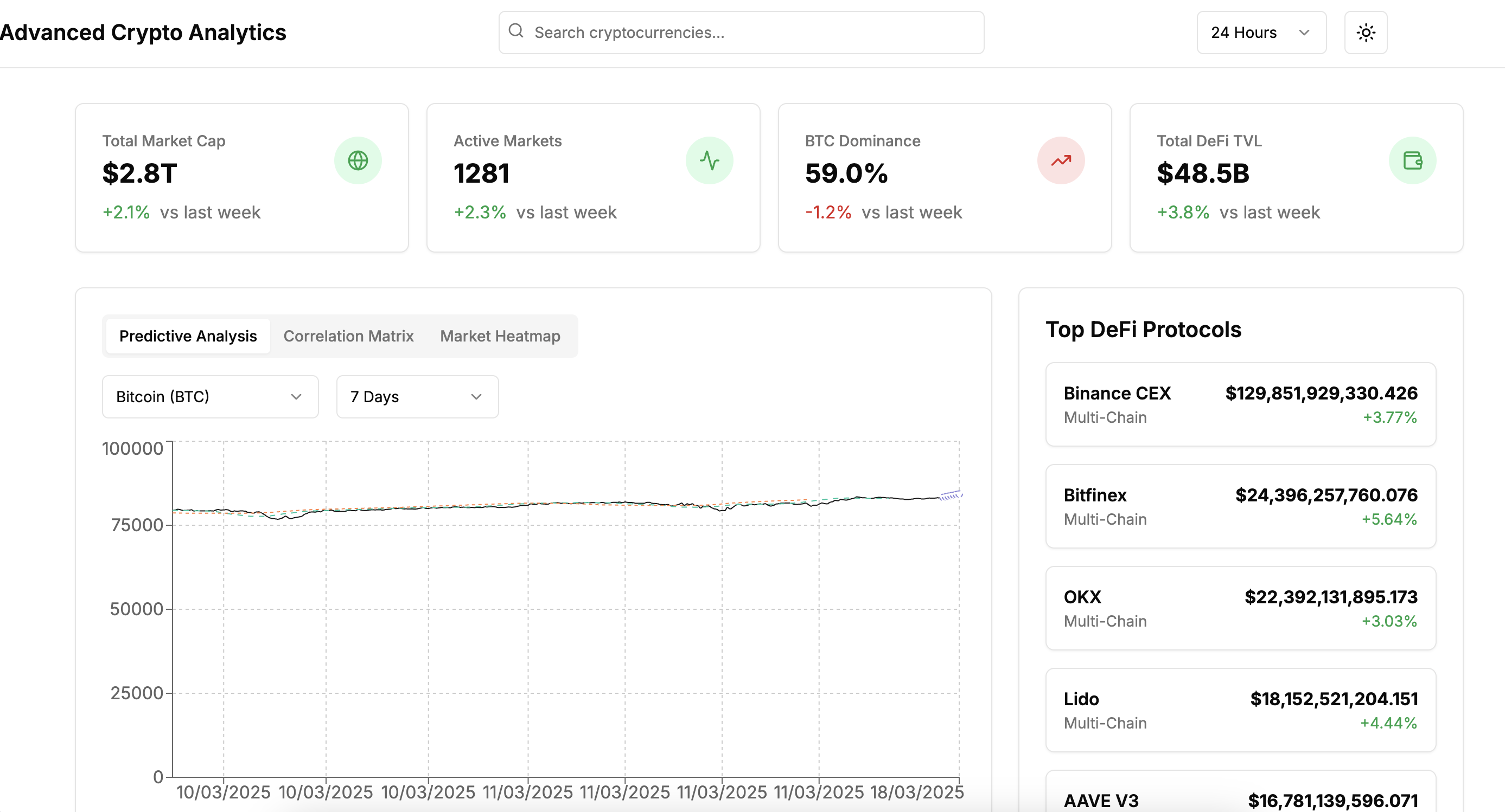 Advanced cryptocurrency analytics platform utilizing Next.js, Recharts, CoinGecko API, and cloud services for real-time data visualization and predictive analytics